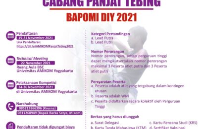⚜️ 💠Panitia Pelaksana POR BAPOMI DIY 2021 Cabor Panjat Tebing Proudly Present💠 ============================================== POR BAPOMI CABOR PANJAT TEBING COMPETITION Hello guys!!!👋 Ada kabar gembira nih🤩 Dalam rangka menyemarakan Pekan Olahraga BAPOMI DIY 2021, kami selaku panitia pelaksana CABOR Panjat Tebing di Universitas Amikom Yogyakarta mengadakan perlombaan nih bagi teman-teman yang memiliki minat serta bakat di […]