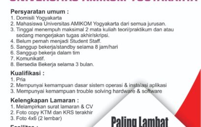 Direktorat Lembaga Penelitian dan Pengabdian Masyarakat (LPPM) Universitas AMIKOM Yogyakarta membuka kesempatan bagi mahasiswa / mahasiswi untuk menjadi student staff dengan kualifikasi sebagai berikut: Persyaratan Umum: 1. Mahasiswa UNIVERSITAS AMIKOM YOGYAKARTA dari semua Program Studi (telah menempuh semua teori dan tinggal mengerjakan TA / Skripsi) 2. Sehat Jasmani dan Rohani 3. Belum pernah ikut Student […]