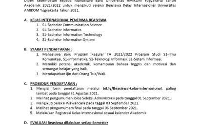 Diberi kesempatan kepada Mahasiswa Baru Universitas AMIKOM Yogyakarta Tahun Akademik 2021/2022 untuk mengikuti seleksi Beasiswa Kelas Internasional Universitas AMIKOM Yogyakarta Tahun 2021. A. KELAS INTERNASIONAL PENERIMA BEASISWA S1-Bachelor of Communication Science S1-Bachelor of Informatics S1-Bachelor of Information Technology S1-Bachelor of Information System B. SYARAT PENDAFTARAN : Mahasiswa Baru Program Regular TA 2021/2022 Program Studi […]