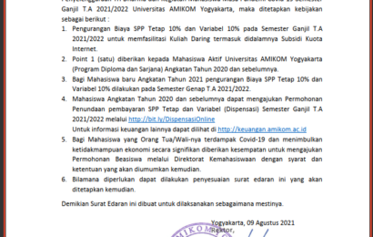 Berdasarkan hasil seleksi Tim Beasiswa Prestasi Penerimaan Mahasiswa Baru Universitas AMIKOM Yogyakarta, maka dengan ini kami sampaikan: Daftar Lolos Seleksi Administrasi Batch 3, Beasiswa Prestasi Universitas AMIKOM Yogyakarta BEASISWA PRESTASI BATCH 3 Bagi calon mahasiswa yang lolos seleksi Administrasi, diharapkan untuk bisa mengikuti seleksi wawancara pada: Hari/ Tanggal: Kamis, 19 Agustus 2021 Pukul […]