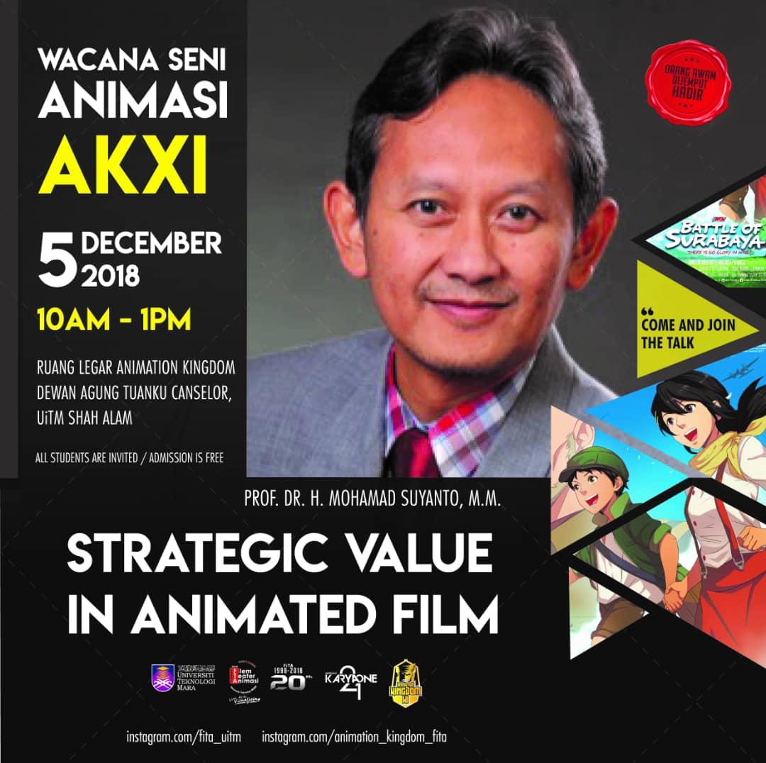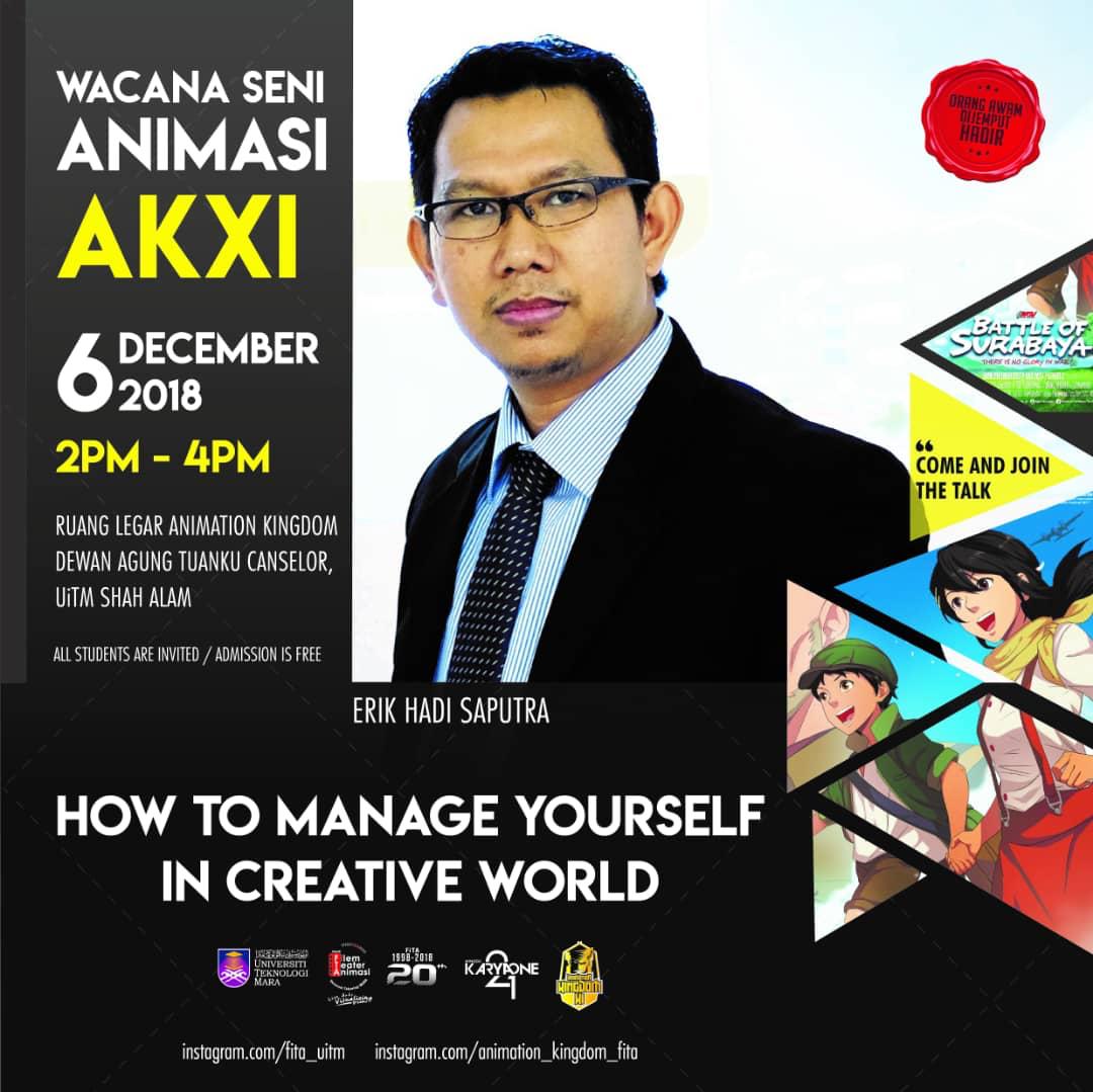 Pada tanggal 5 Desember 2018, Universitas Teknologi Mara (UiTM) mengadakan acara Wacana Seni Animasi AKXI di RUANG LEGAR ANIMATION KINGDOM, DEWAN AGUNG CANSELOR, UiTM Shah Alam. Acara ini menghadirkan Rektor Universitas Amikom Yogyakarta, Prof. Dr. M. Suyanto, MM, dan Direktur Kehumasan Dan Urusan Internasional serta Dosen Fakultas Ekonomi dan Sosial Erik Hadi Saputra, S.Kom, M.Eng. sebagai pembicara utama.