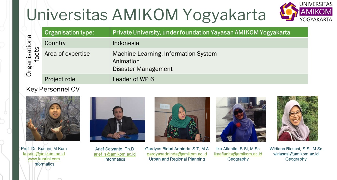 Direktur Pascasarjana Universitas Amikom Yogyakarta sekaligus juga PIC Universitas Amikom Yogyakarta dalam konsorsium tersebut, Prof. Dr. Kusrini., menyampaikan bahwa Keterlibatan para dosen AMIKOM dalam penelitian ini, selain memberikan pengalaman bagi yang bersangkutan juga akan mendorong dosen melibatkan mahasiswa baik D3, S1 maupun S2 dalam proses penelitian sehingga mahasiswa pun tidak hanya mendapatkan teori terkait dengan materi-materi sesuai kurikulum tetapi juga pengalaman nyata bekerja bersama dengan para peneliti dunia.