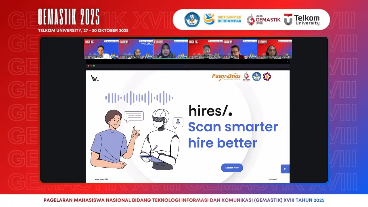 Babak final diisi dengan sesi pitching dan penjurian daring, di mana para juri mengevaluasi model bisnis, potensi pasar, dan validasi produk. Salah satu juri, Karyana Hutomo, S.T., M.M. dari BINUS Incubator, menyoroti bagaimana HiresAI mampu mengombinasikan inovasi teknologi dengan nilai bisnis yang realistis.