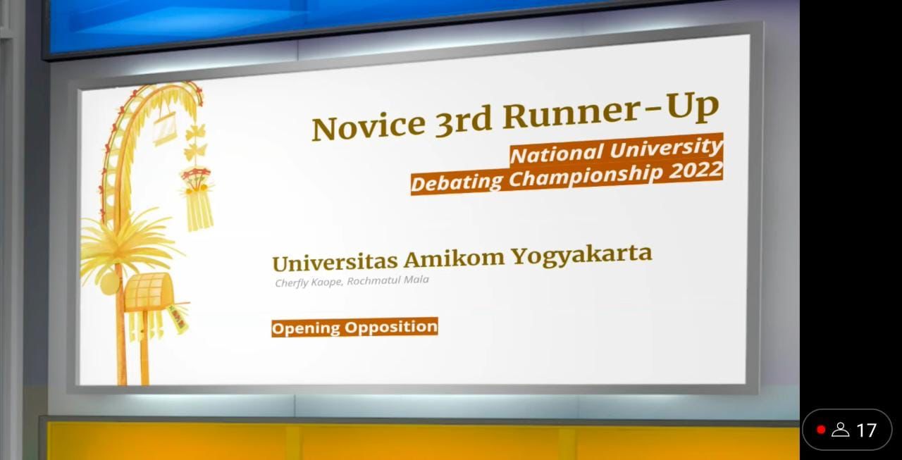 Tim NUDC Universitas AMIKOM Yogyakarta berhasil menjadi Juara 3 Dalam National University Debating Championship (NUDC) dan Kompetisi Debat Mahasiswa Indonesia (KDMI) Tahun 2022, yang berlangsung secara hybrid di Universitas Udayana pada tanggal 11-17 September 2022.