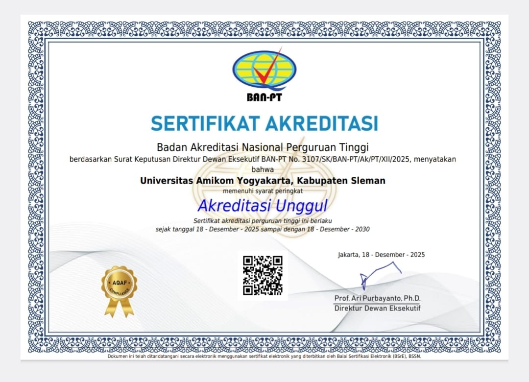 Yogyakarta, 18 Desember 2025 — Universitas AMIKOM Yogyakarta secara resmi meraih peringkat Akreditasi Unggul dari Badan Akreditasi Nasional Perguruan Tinggi (BAN-PT). Penetapan ini tertuang dalam Surat Keputusan Direktur Dewan Eksekutif BAN-PT Nomor 3107/SK/BAN-PT/Ak/PT/XII/2025 tentang Peringkat Akreditasi Perguruan Tinggi Universitas AMIKOM Yogyakarta, Kabupaten Sleman.