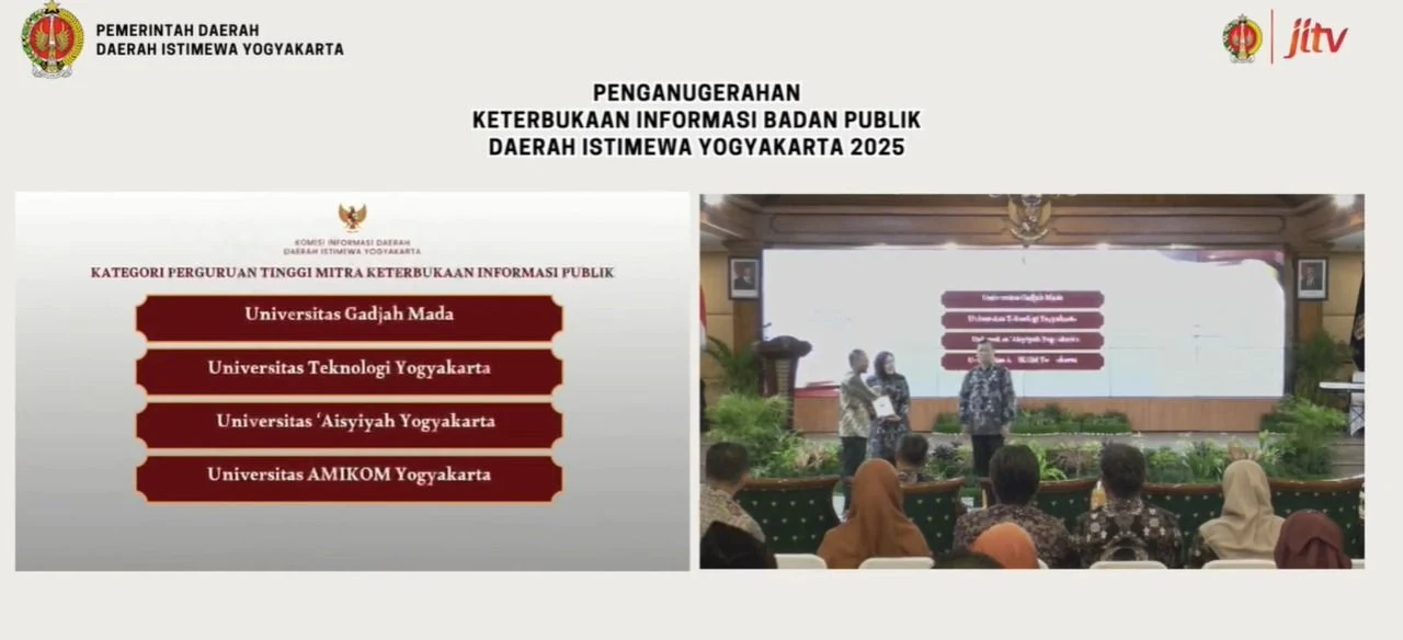 Yogyakarta, 28 November 2025 — Universitas AMIKOM Yogyakarta menerima apresiasi dari Komisi Informasi Daerah Istimewa Yogyakarta (DIY) dalam acara Anugerah Keterbukaan Informasi Badan Publik 2025 yang diselenggarakan di Gedung Sahid Raya Hotel, Yogyakarta. Penghargaan tersebut diberikan sebagai bentuk pengakuan atas peran Universitas AMIKOM Yogyakarta sebagai mitra dalam penyelenggaraan keterbukaan informasi publik di wilayah DIY. Apresiasi ini diserahkan secara langsung oleh Komisi Informasi DIY sebagai bagian dari rangkaian penganugerahan yang melibatkan ratusan badan publik dari berbagai sektor.