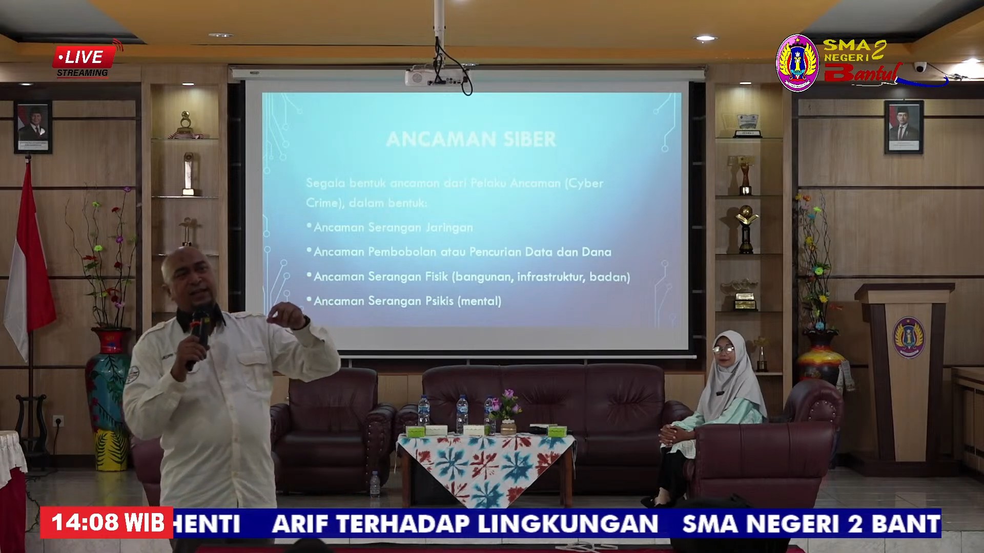 Acara dibuka dengan sambutan dari Kepala SMA Negeri 2 Bantul, Isti Fatimah, M.Pd., yang menyoroti bahwa banyak tenaga pendidik yang belum menyadari ancaman digital yang bisa menyerang sistem administrasi sekolah maupun data pribadi mereka. Ia menyebutkan bahwa banyak kasus pencurian data yang terjadi di berbagai institusi pendidikan, di mana informasi siswa maupun tenaga pendidik disalahgunakan untuk berbagai kejahatan digital, seperti pinjaman online ilegal, pencurian akun media sosial, hingga peretasan sistem akademik.